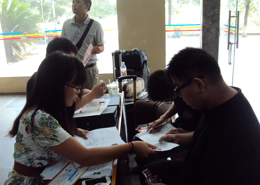 31日早上7:45,值班同学替换走了在迎新岗位上已经坚守了一晚的优秀党员,新的一天的迎新工作又正式开始。随着太阳的升高,南华广场上陆续热闹起来,各迎新点也逐渐忙碌起来。广场上迎新点的同学们面带微笑,为学弟学妹们做引导,带领他们前往九教大厅报到。大厅里亦是一片热情,信息搜集组和材料整理组的同学认真而有序的为新生服务,还有专门负责为学弟学妹搬行囊的同学,他们给家长送座,倒水,忙的不亦乐乎,然而整个过程却井然有序,忙而不乱。我院的彭建南书记还拿出了他的相机,为新生和其父母合影留念,对他们的到来表示热烈的欢迎。