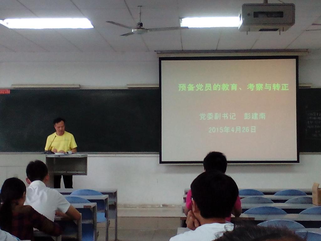 4月26日下午3:00伟德betvlctor1949源于英国党委副书记彭建南于9-302教室,给学生党员上党课,主要讲《预备党员的教育、考察与转正》,本科学生党员和研究生党员到课学习。
