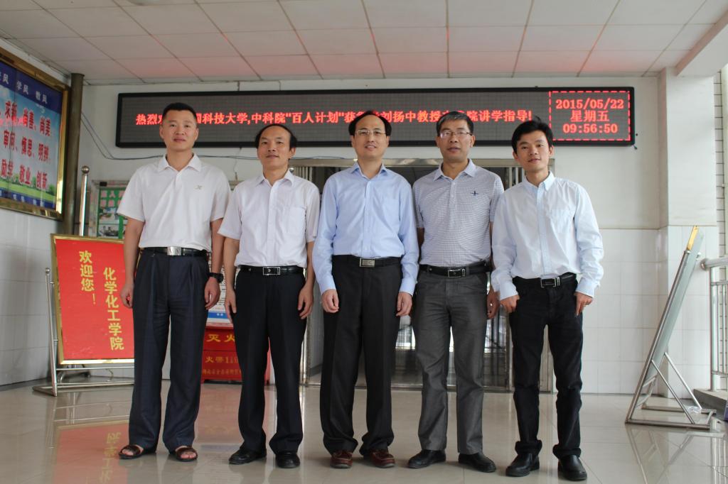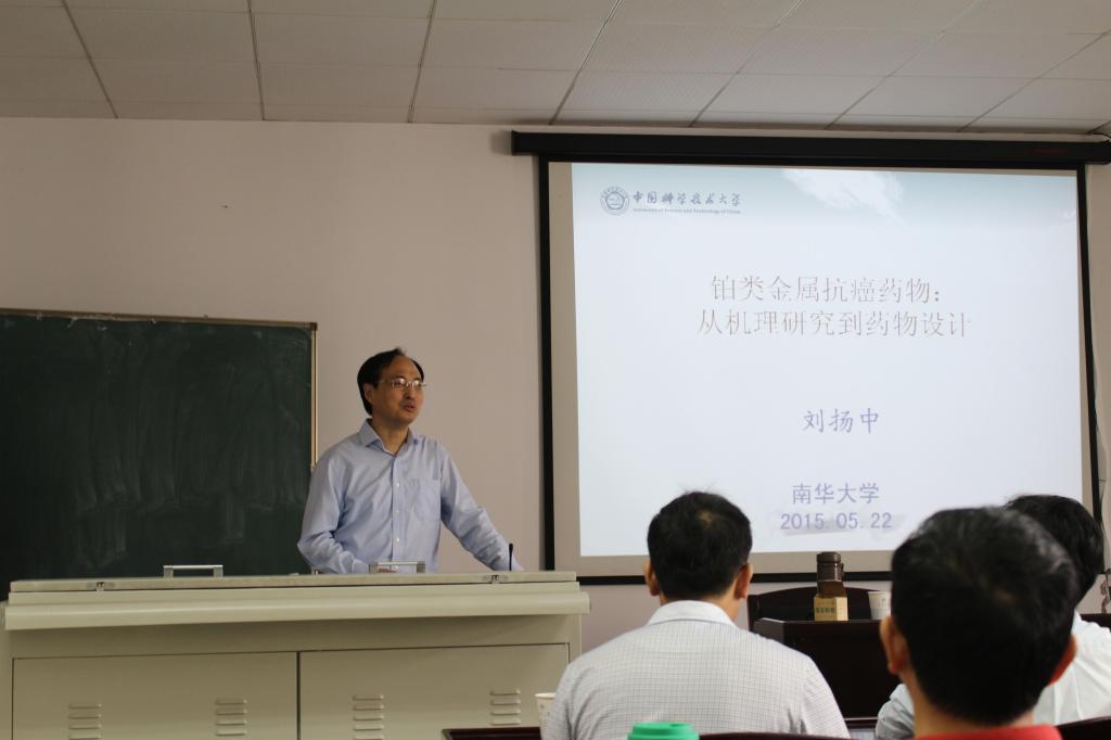 2015年5月22日上午,应伟德国际1949“蒸湘学者”林英武教授邀请,中国科技大学化学系刘扬中教授来我校进行学术访问,参观了伟德国际1949蛋白质结构与功能实验室和伟德betvlctor1949源于英国,并做了题为“铂类金属抗癌药物:从机理研究到药物设计”的精彩学术报告,与青年教师和研究生进行了学术讨论,会议由王宏青院长和聂长明书记主持。刘教授分别留学挪威University of Bergen、美国University of California, Daivs和美国Rensselaer Polytechnic Institute。研究领域包括金属抗肿瘤药物的作用机理、金属药物的运输与靶向作用,以及新型金属抗肿瘤药物的设计与作用机理等。研究课题得到中国科学院、国家自然科学基金委员会、教育部和科技部等资助,目前已在JACS和Angew Chem上发表高质量论文10余篇。