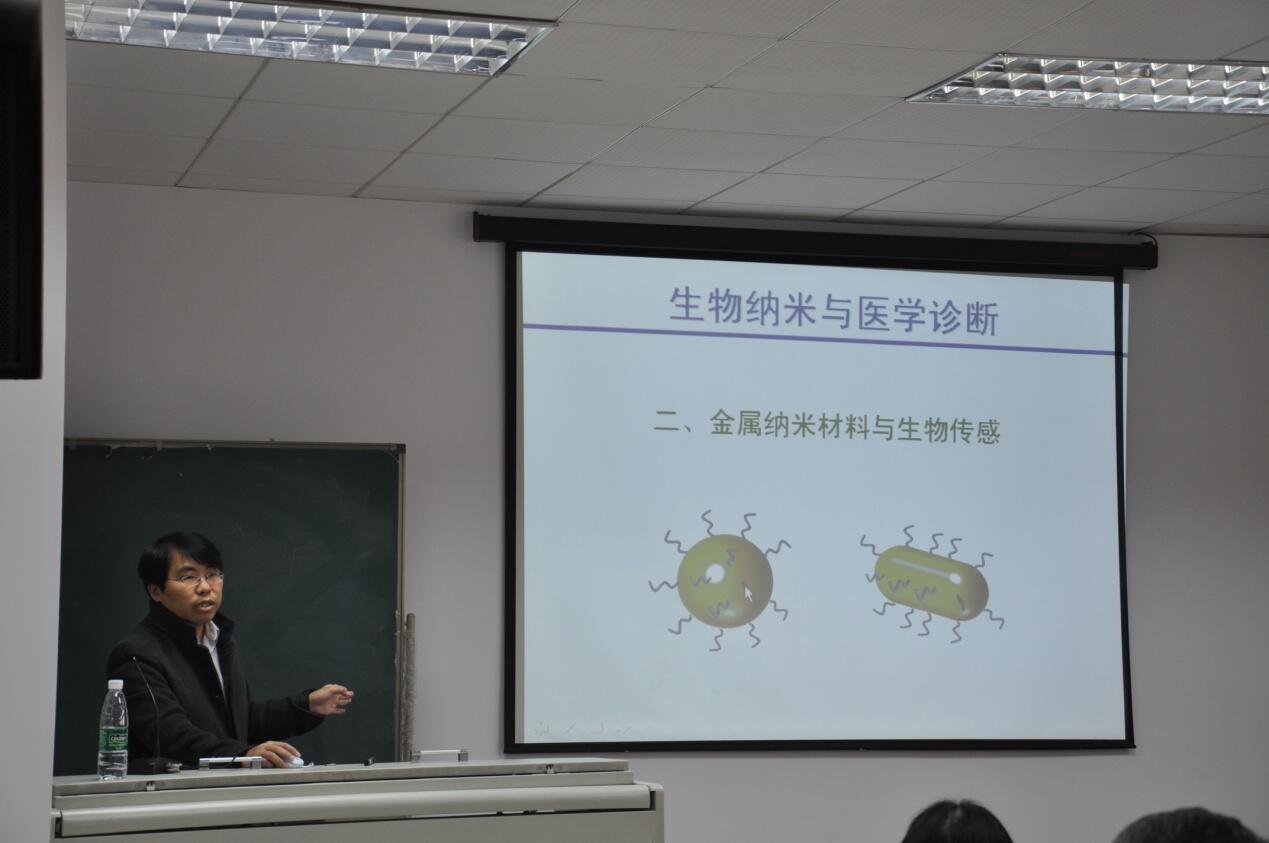 报告会上,吴再生教授主要讲述“核酸纳米器件与生命分析”、“金属纳米材料与生物传感”这两个方面。首先介绍了目前该领域的研究方向和状况,然后生动地讲解了介稳态核酸纳米片、近似穿插作用的核酸纳米套索环等核酸纳米器件的形成机制和作用机理,接着又详细地说明了金属纳米富集与近距离牵引扩增电化学传感技术和金属纳米材料的表征方法。报告接近尾声时,研究生与吴教授还进行了愉快地交流,吴教授对在场师生的提问做出详细解答,他精彩讲座和严谨的科研态度使在座的各位师生受益匪浅,赢得了大家热烈的掌声。
