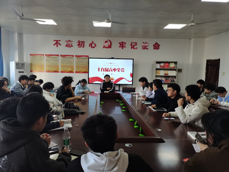 会议由“三个需要”引出,具体向与会人员介绍了“三个需要”,“四个伟大成就”,并解释了中国共产党为什么能,以及中国共产党百年奋斗对于个人的启示。在进行学习后同学们分享了自己对于十九届六中全会的感悟与体会,并表示要在未来的日子里将全会精神内化于心,外化与形,积极从百年党史中汲取养分向百年前那些为了新中国不懈奋斗的革命先烈学习。