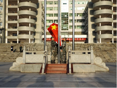 仪式伊始,国旗班庄重地将国旗护送至升旗台。伴着庄严的国歌声,五星红旗冉冉升起,迎风飘扬。学院师生全体肃立,齐唱国歌,向国旗行注目礼。