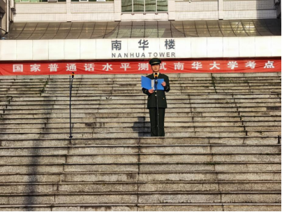 退伍大学生代表化卓2101班喻江浩进行国旗下演讲。他向全体同学发出号召:“我们生逢盛世,当不负盛世,我们要努力学习,传承红色基因,为中华民族伟大复兴贡献我们的青春力量。当前学校迈入新发展阶段,以新思想、新举措助推学校双一流建设,身为南华学子同样要为学校双一流建设贡献我们的青春力量。”