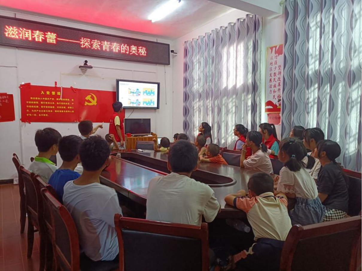 实践服务团成员在多逸寨村服务中心会议室举办志愿课堂,深入浅出、生动形象地向孩子们讲解了防侵害知识,从哪些是身体的隐私部位、什么是性侵害、遇到侵害应该如何求助三个方面与孩子们进行了交流互动。