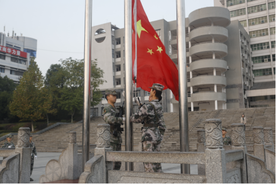 升旗仪式伊始,国旗班步伐铿锵,将国旗护送至升旗台。朝暾初露,鲜艳的五星红旗在激昂的国歌声中冉冉升起,迎风飘扬。学院师生全体肃立,向国旗行注目礼,齐声唱起昂扬的国歌。