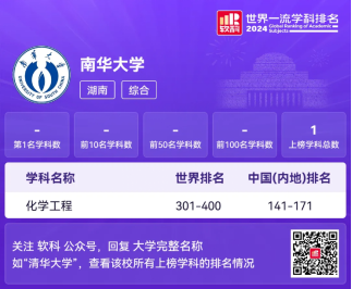 我校化学工程学科成功上榜,位列世界排名301-400位、中国(内地)排名141-171位。