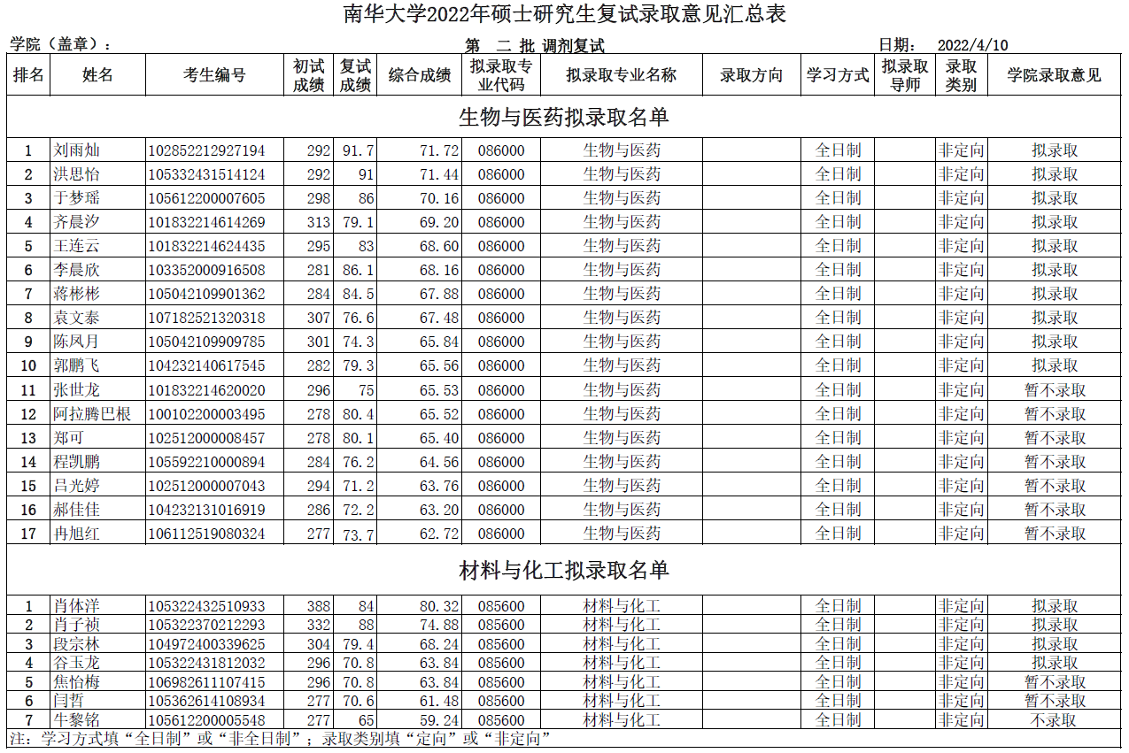 鉴于考生吴璐璐(102512000007064)王云龙(105042109909784) 钱基君(105582290101163)王梦佳(104252540004018)丁晨麓(103582210001593)李大康(105322431812014) 任远航(102462330712574)放弃录取名额,按照学校及我院研究生招生工作的复试方案,根据2022年4月10日的复试成绩排名,现公布最终拟录取名单如下。对复试成绩及上述同学的建议录取有异议,请以书面形式于2022年4月16日前向学院反映。反映情况要实事求是,具体真实,署真实姓名,以便调查核实。电话:0734-8282375,联系人:王老师。
