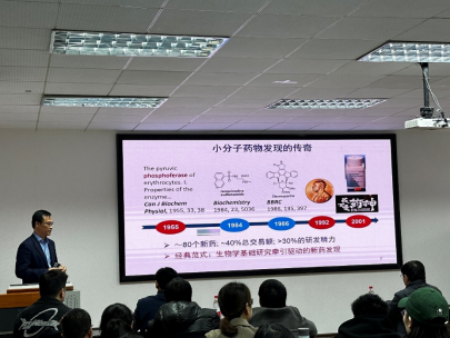 在报告中,杨财广研究员带来了题为“药物发现化学生物学”的学术报告。杨老师以“小分子药物发现”为切入点,向同学们传达了他的科研思路。他以自己做的两个课题:选择性FTO抑制剂和选择性CIpP抑制剂为例,讲述了自己的科研之路,贯穿了他对新药研发独特的思考和化学生物学工具的合理应用。