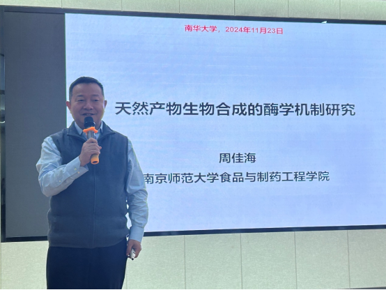 2024年11月23日,南京师范大学周佳海教授应我院邀请作了题为“天然产物生物合成的酶学机制研究”的学术报告,报告由林英武教授主持,部分师生参加会议。