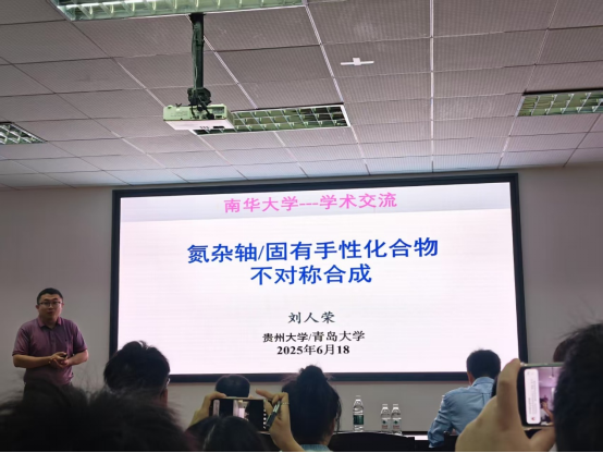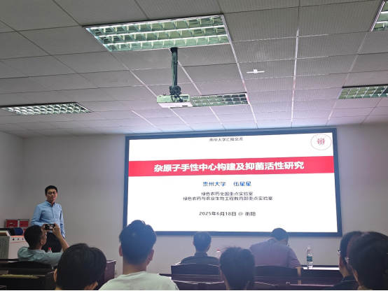 报告中,刘人荣教授作了题为“氮杂轴/固有手性化合物不对称催化合成”学术报告。刘教授从轴手性化合物在天然产物、医药、农药、染料及光电材料分子的重要性和N-杂轴手性化合物的合成挑战切入。针对氮杂轴/固有手性化合物的不对称合成瓶颈,刘教授介绍了他们团队在氮杂轴/固有手性化合物合成中的新策略。伍星星教授作了题为“有机催化杂原子(氮、硫、磷)手性中心构建与抑菌活性研究”学术报告。伍教授首先介绍了含杂原子手性化合物在药物、催化和材料科学等领域中具有重要作用。伍教授团队利用氮杂环卡宾(NHC)等有机小分子催化实现了氮、硫和磷立体中心不对称构建,为含杂原子手性骨架的高选择性合成提供了高效路径,同时所合成手性功能分子在农药活性评估中表现出良好的抗水稻白叶枯病菌、柑橘溃疡病菌等抑菌活性。